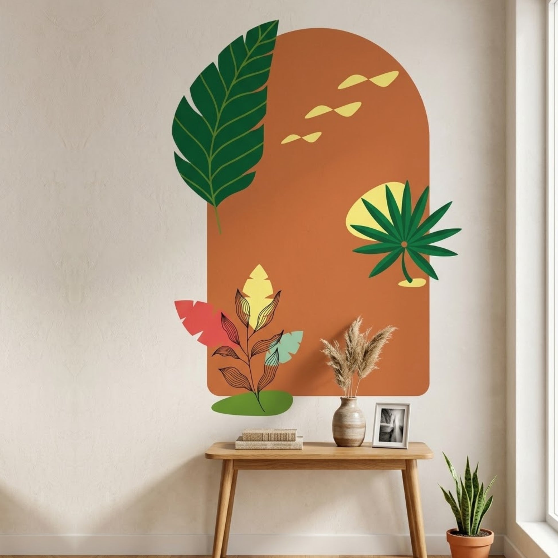 - Featuring a stylish arch design with tropical leaves and plants, this wall sticker creates a calm and aesthetic atmosphere in any room.