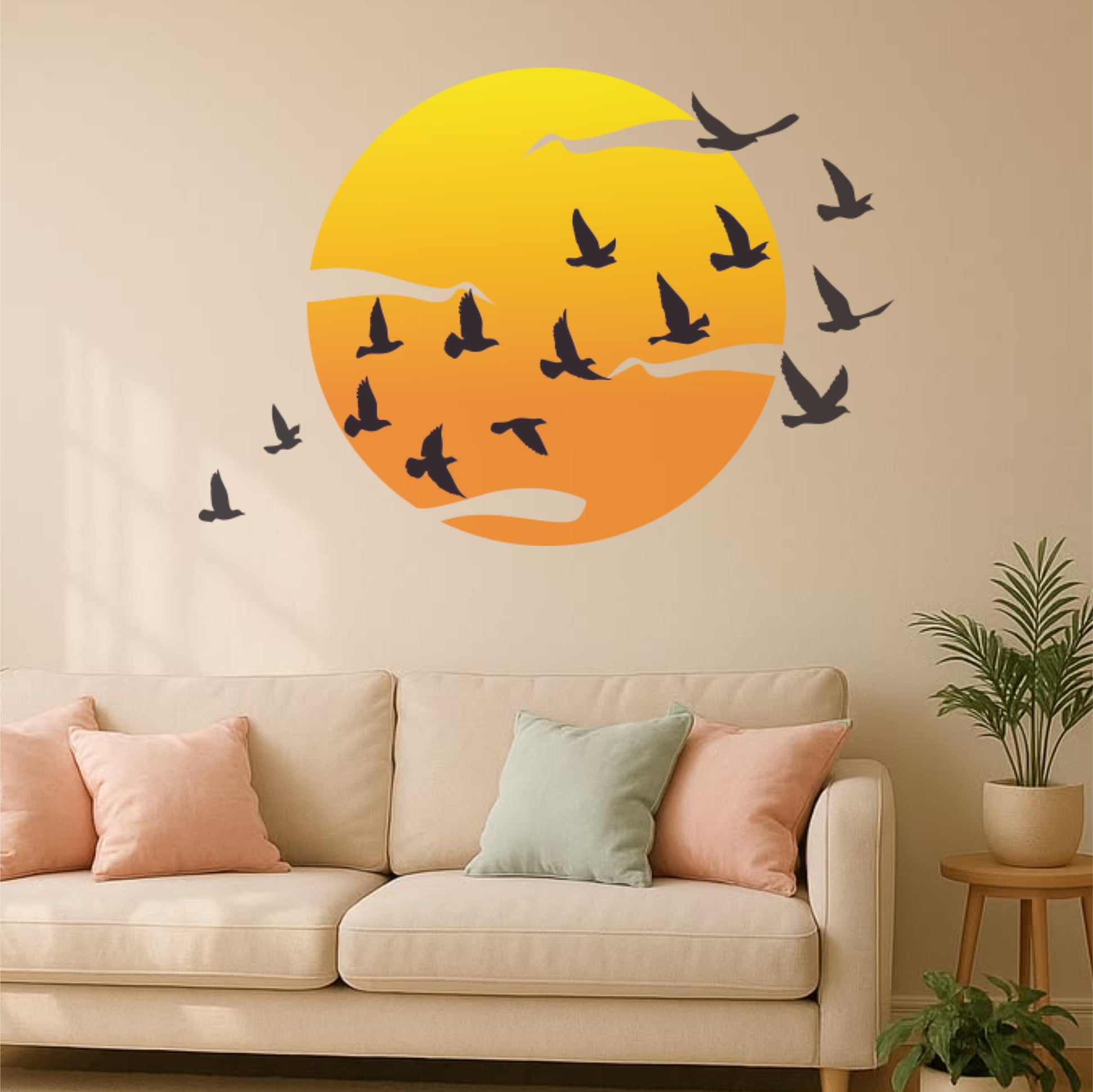 - Warm sunset design with flying birds silhouette adds a cozy and vibrant touch to your walls.